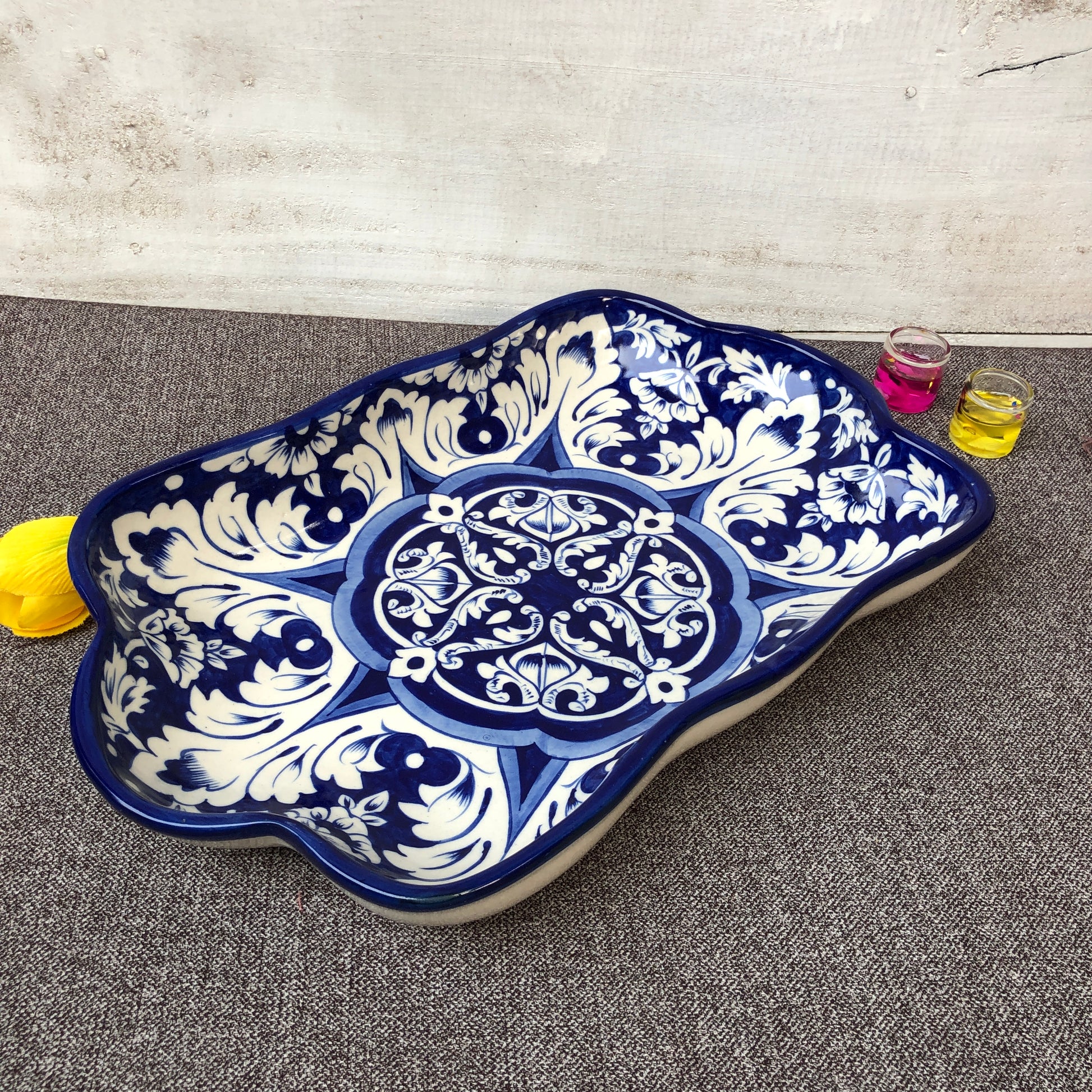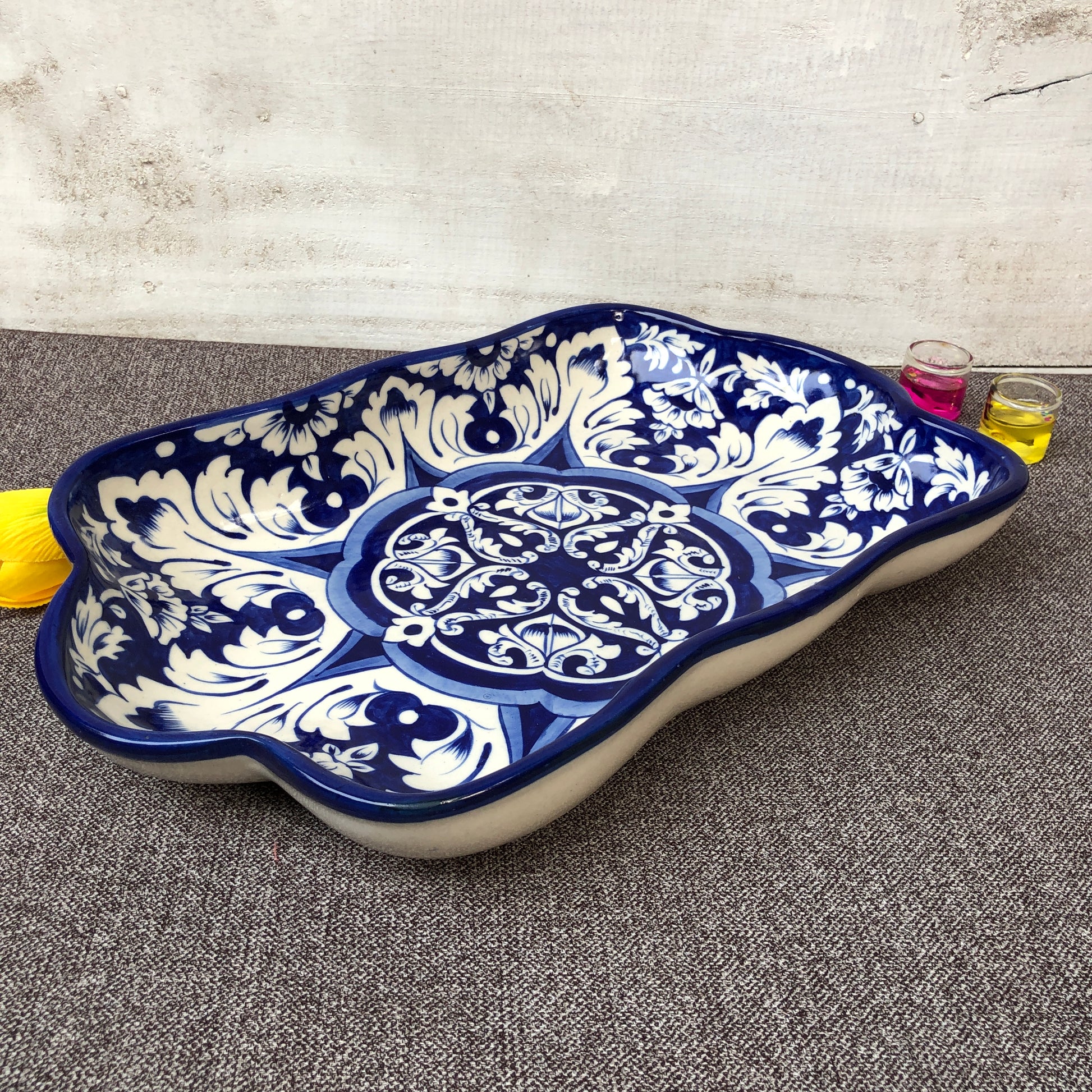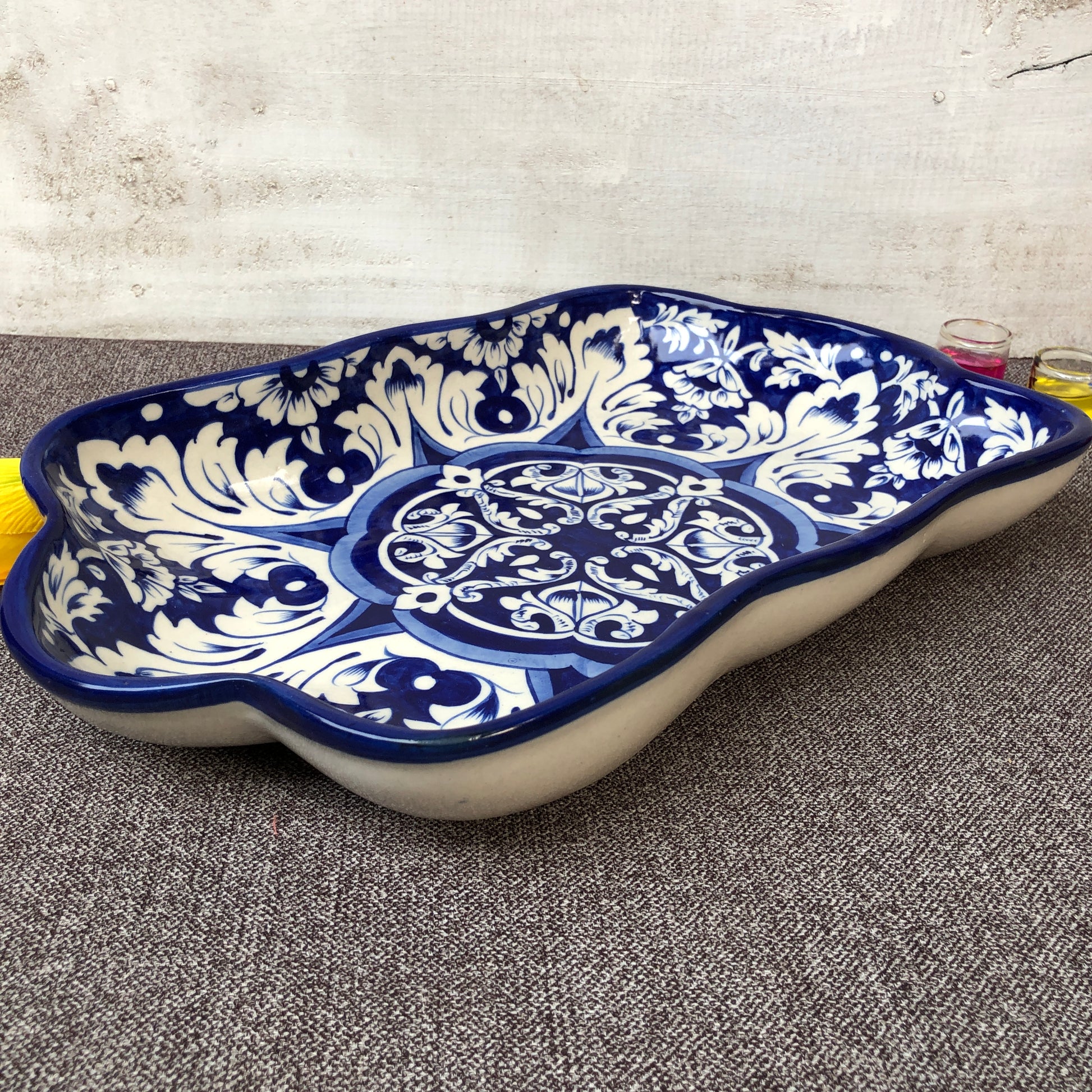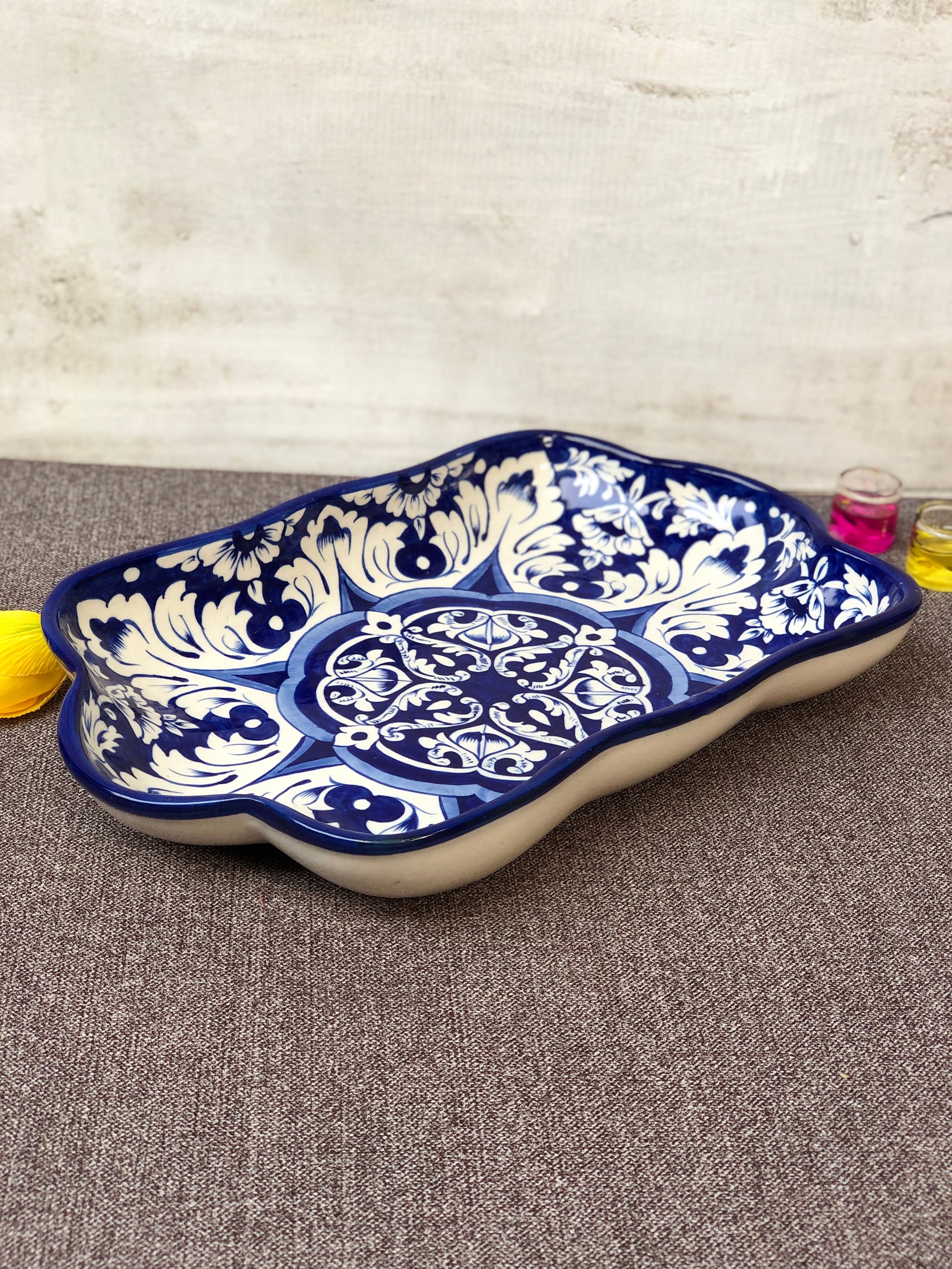 This new rectangle-style dish gives a fresh appearance. This is a new arrival in our inventory. Hand-painted and handcrafted by skilled artisans. The glaze is put by hand for the artisan-made look and produced in Multan. This dish can be used for salads, rice, pasta, and BBQ many more dishes to enhance hospitality.
