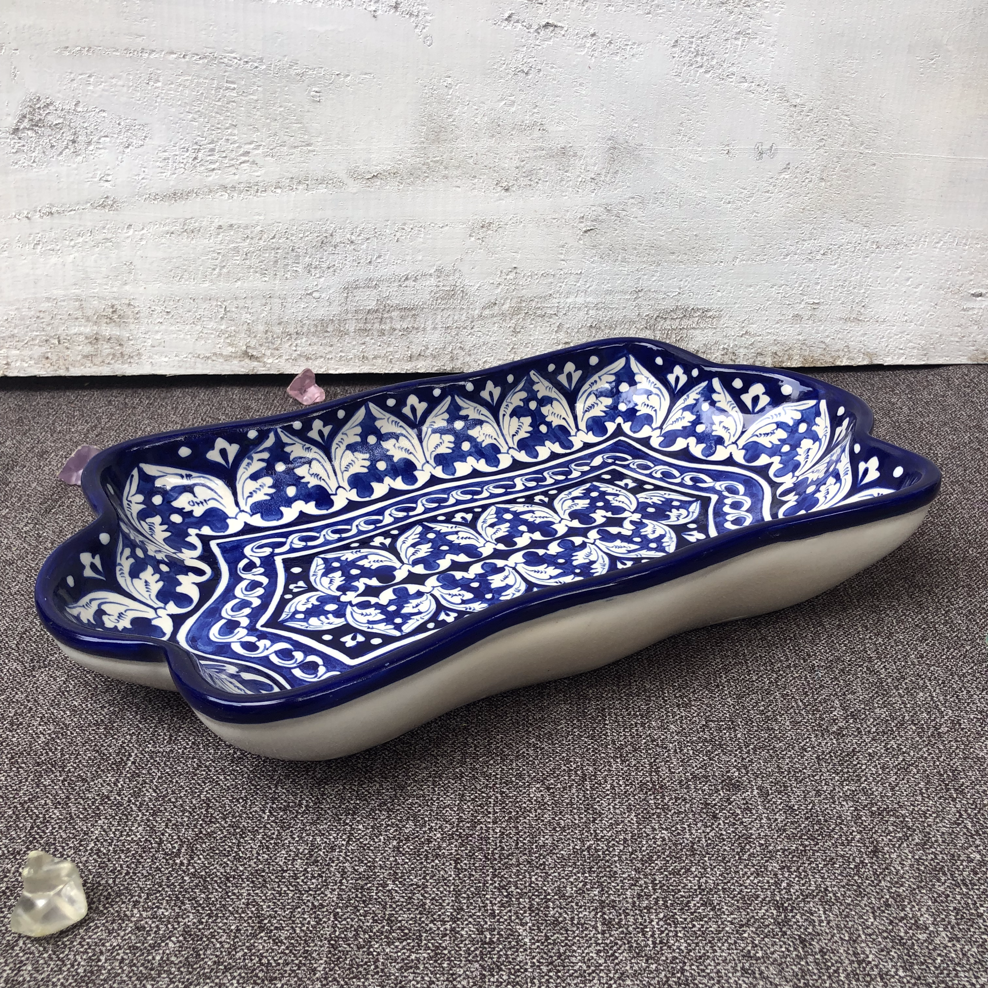 This new rectangle-style dish gives a fresh appearance. This is a new arrival in our inventory. Hand-painted and handcrafted by skilled artisans. The glaze is put by hand for the artisan-made look and produced in Multan. This dish can be used for salads, rice, pasta, and BBQ many more dishes to enhance hospitality.