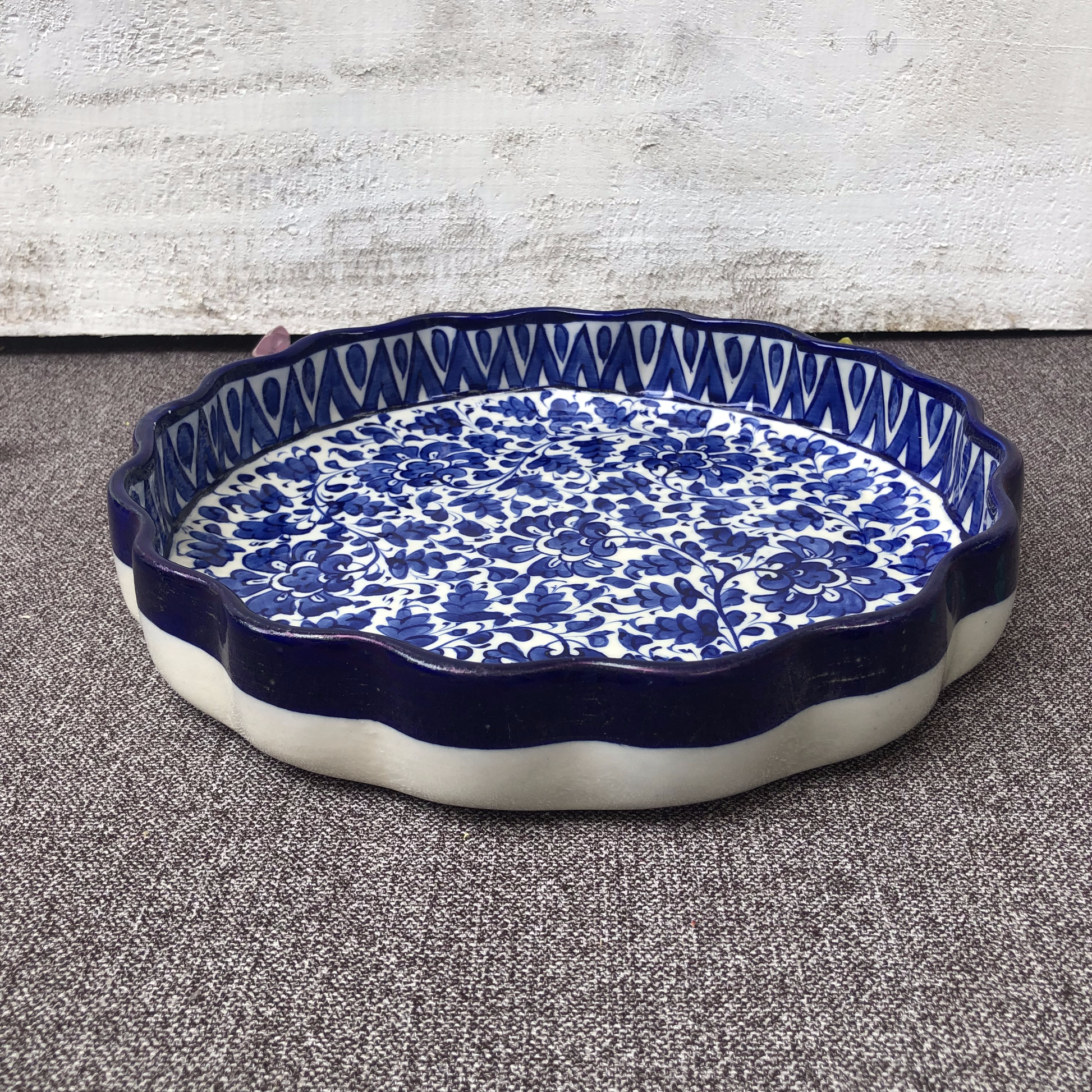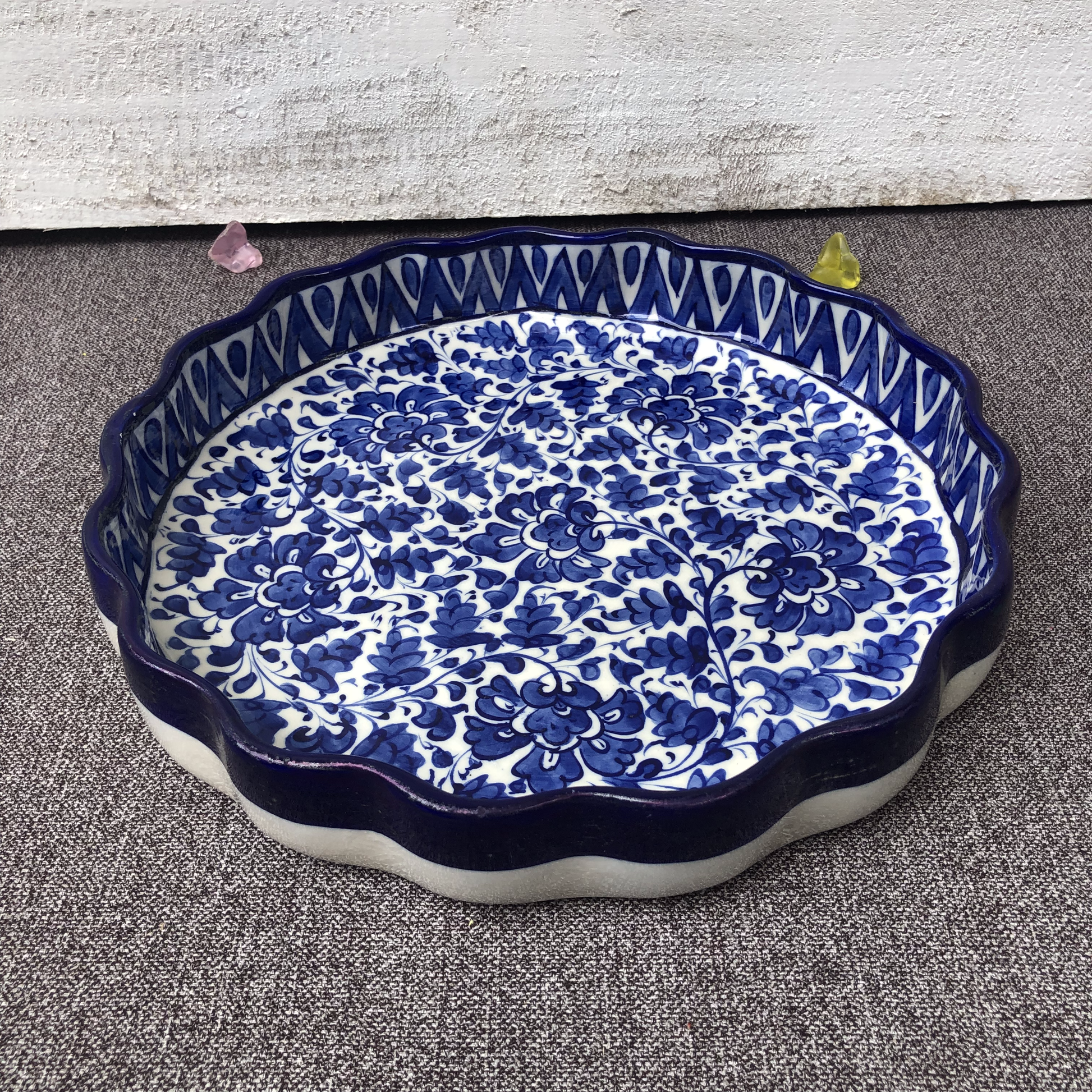 This unique ceramic round piece is designed to serve parties. It features an intricate pattern mixed with abstract in ocean blue undertone. Hand crafted by the skilled artisans of Multan. This beautiful round serving dish can be used for presenting BBQ, Salads, and many more.