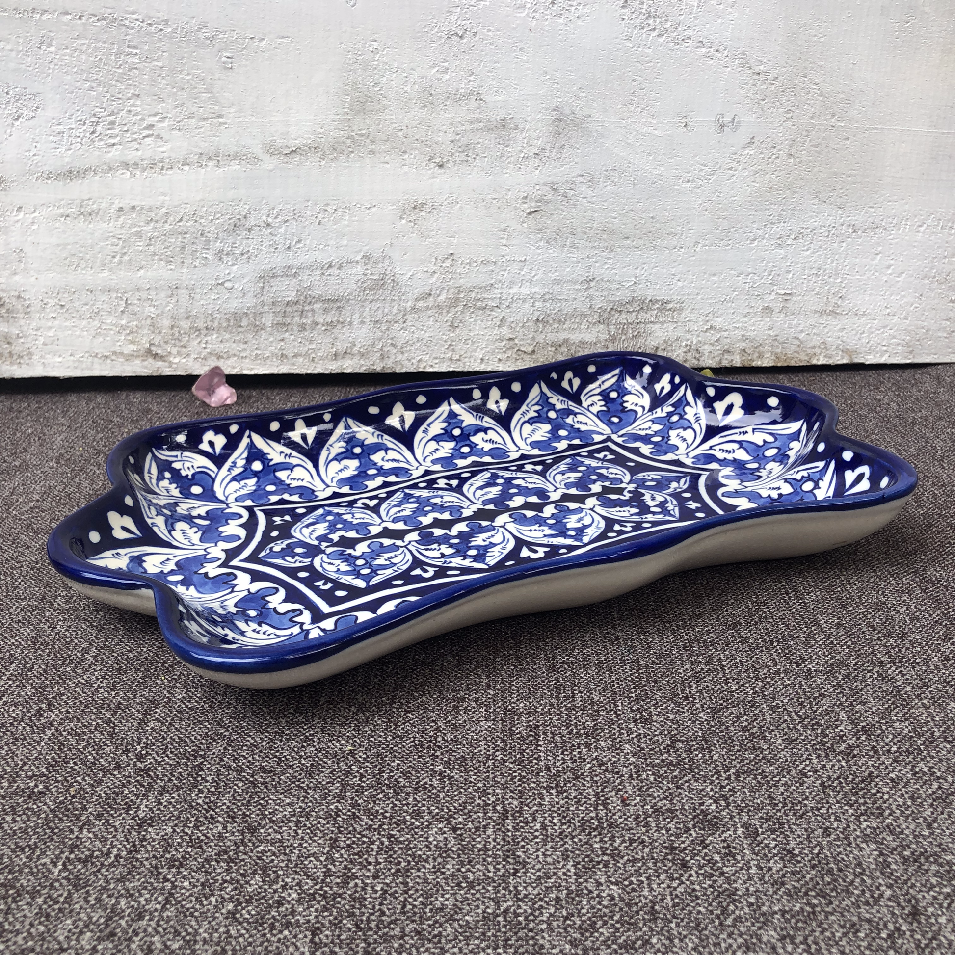 This new rectangle-style dish gives a fresh appearance. This is a new arrival in our inventory. Hand-painted and handcrafted by skilled artisans. The glaze is put by hand for the artisan-made look and produced in Multan. This dish can be used for salads, rice, pasta, and BBQ many more dishes to enhance hospitality.