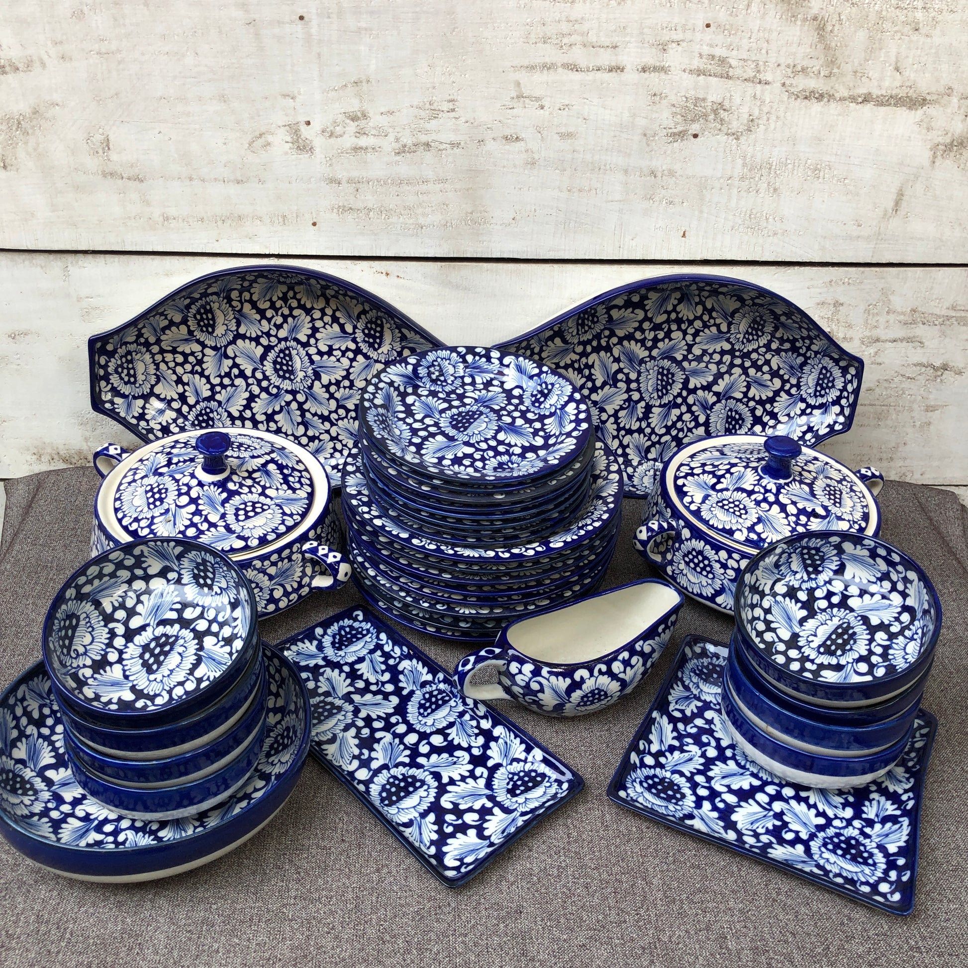 It is handmade and hand-painted. We guarantee it's Glaze and paint. All the pieces are microwave and dishwasher-safe. Totally made in Pakistan.