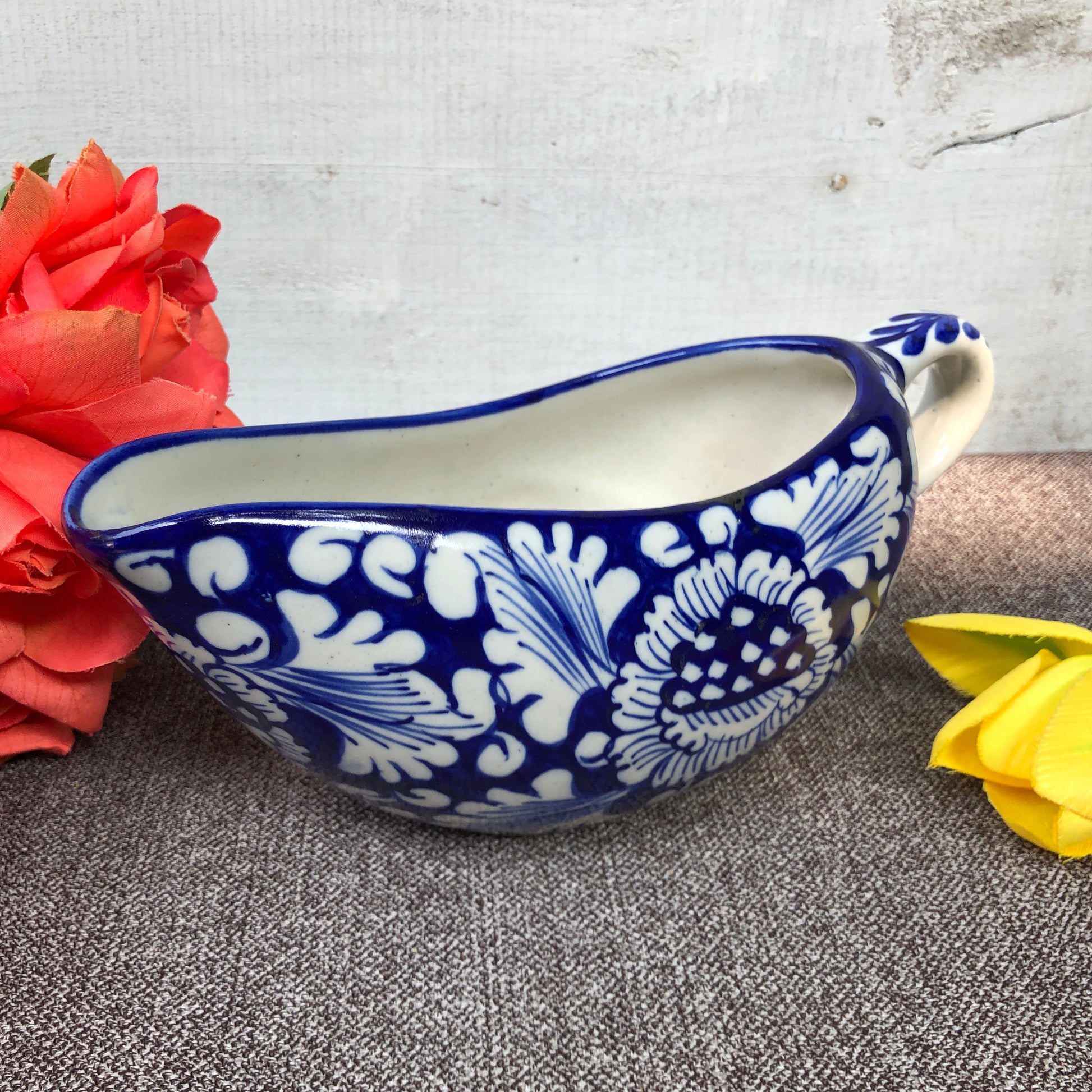 This is our new design pot that will serve raita in a new style. It features an intricate pattern mixed with an abstract ocean blue undertone. Handcrafted by the skilled artisans of Multan.