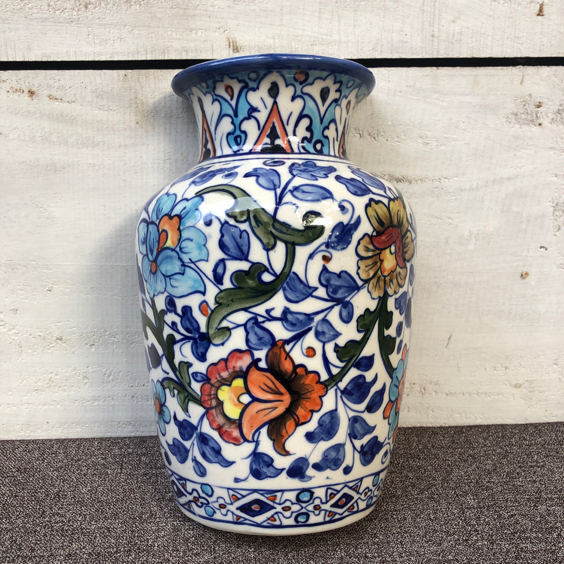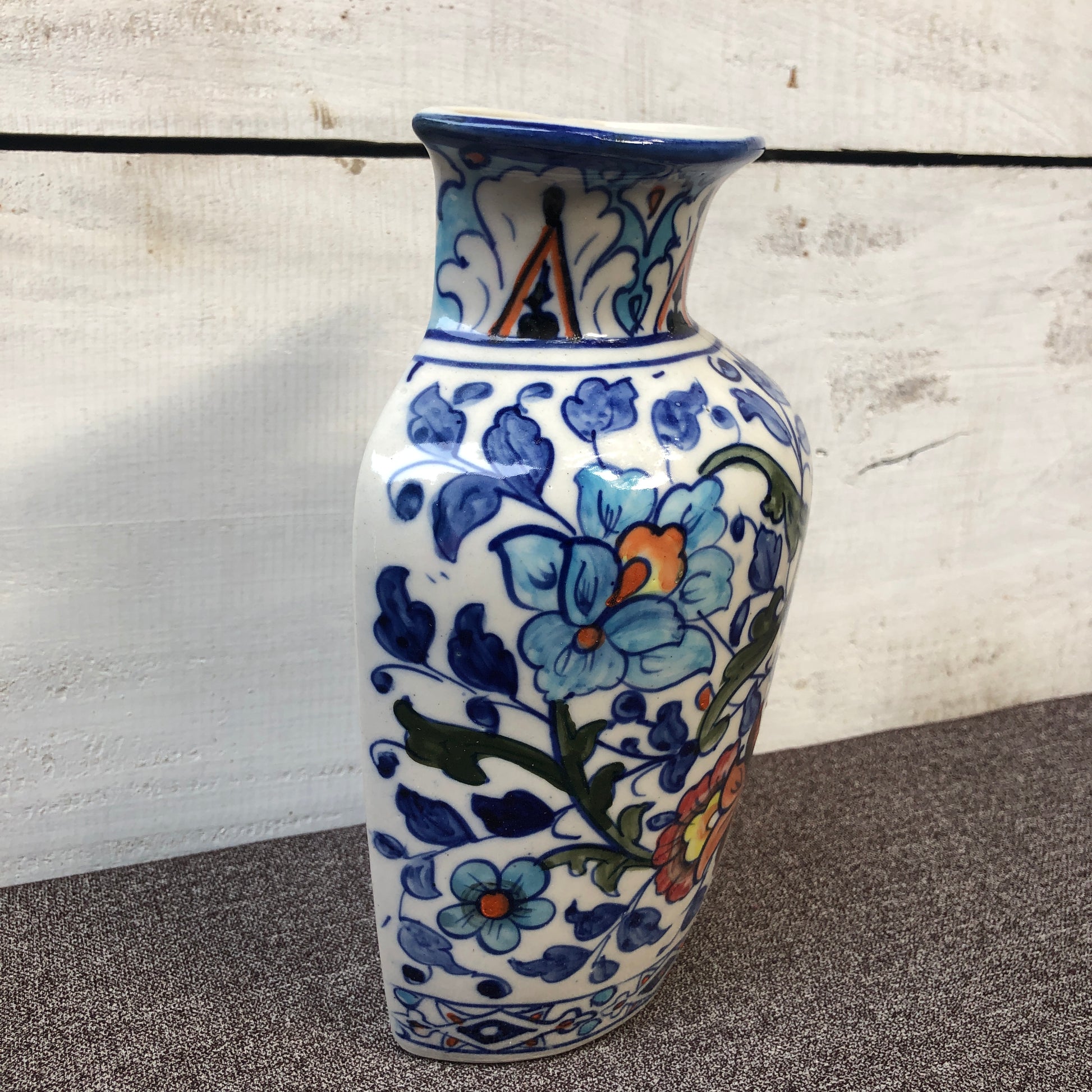 This bottle-style planter offers a traditional and appealing look. It features a blue undertone on the base and a multi-colored pattern on top. Perfect for any table setting or decor. Handcrafted by the artisans of Multan. This planter can be used for cutting flowers, artificial plants, and mud plants for decoration purposes.