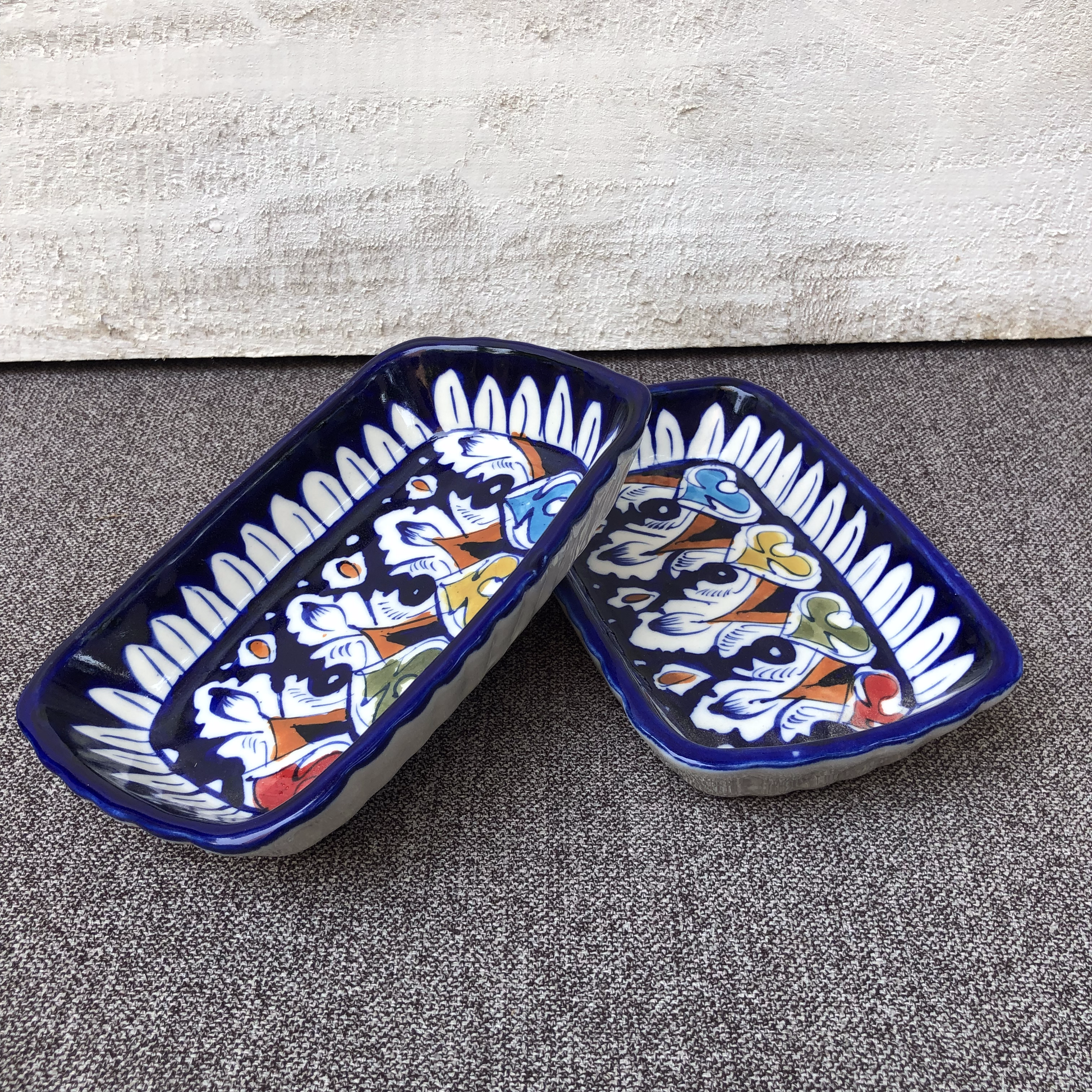 This unique ceramic piece is designed to serve parties. It features an intricate pattern mixed with an abstract ocean-blue undertone. Handcrafted by the skilled artisans of Multan. This beautiful dish can be used for presenting BBQ, and many more.