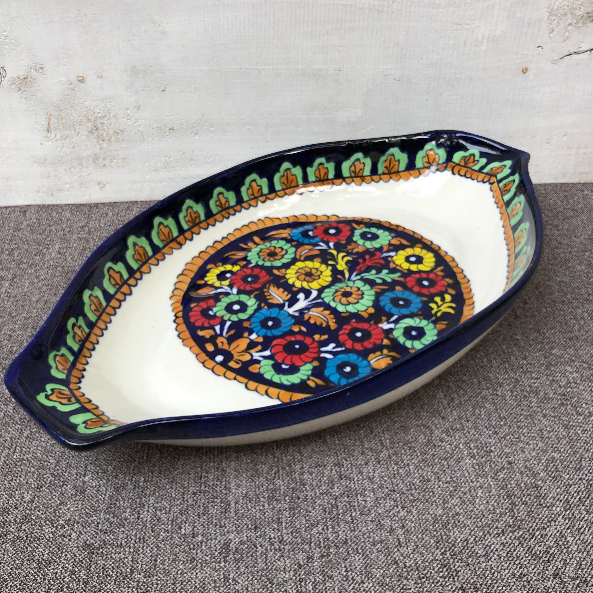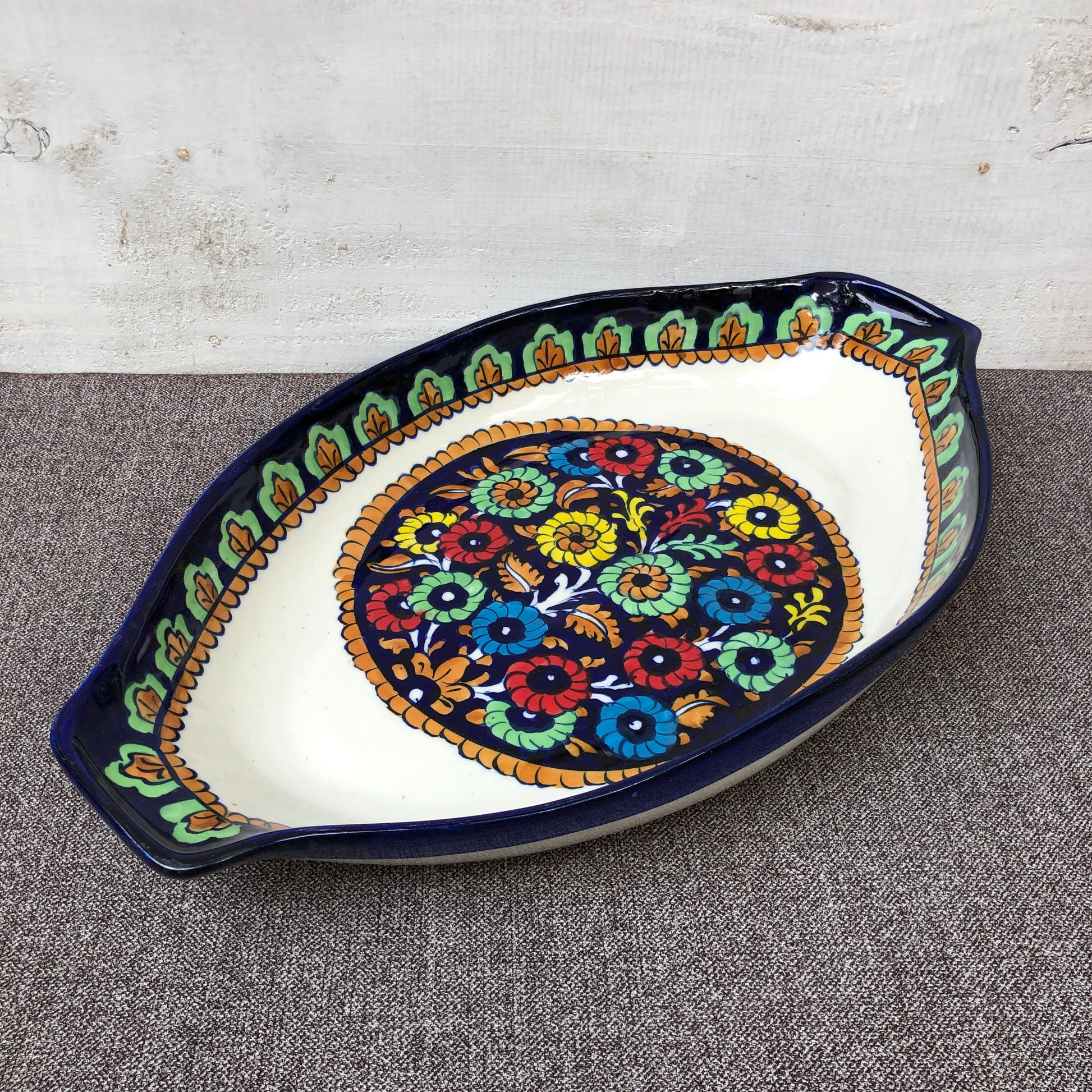 This piece of the ceramic dish is large in size and has an oval shape. Designed for bigger servings. It features an intricate pattern mixed with an abstract ocean blue undertone. Hand crafted by the skilled artisans of Multan. This beautiful dish can be used for presenting Rice, BBQ, and many more.