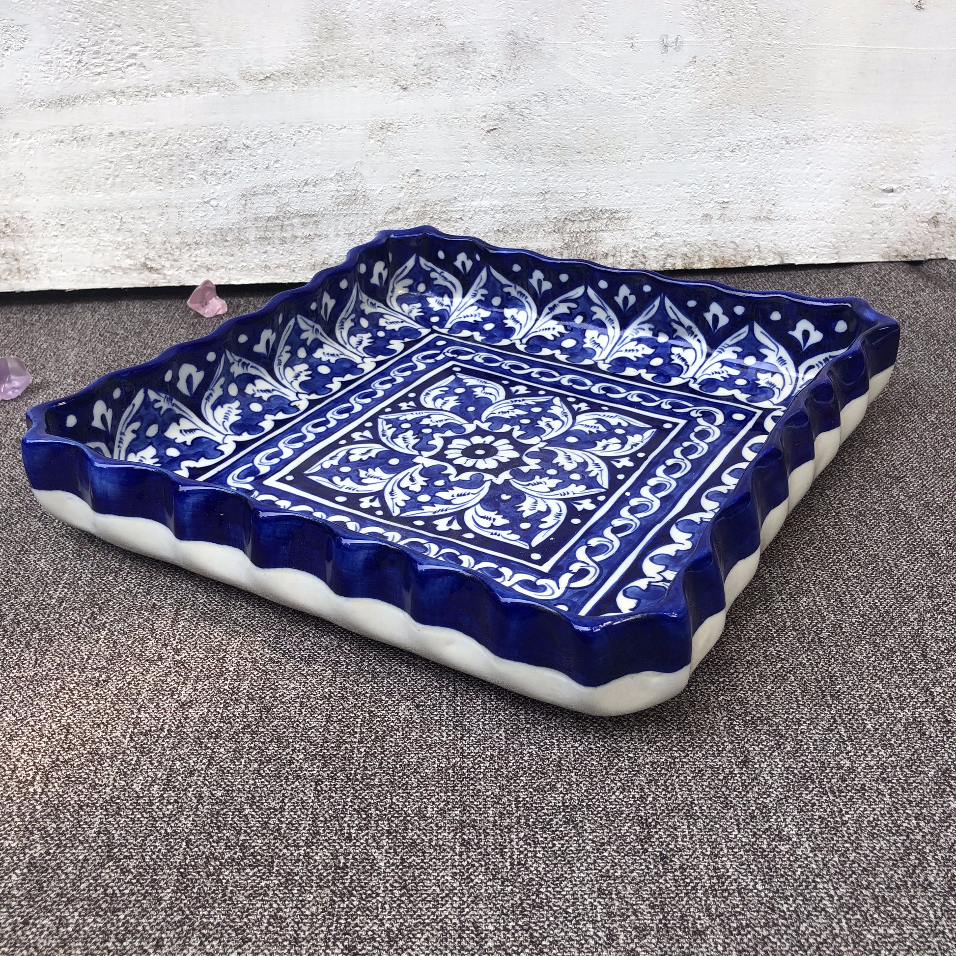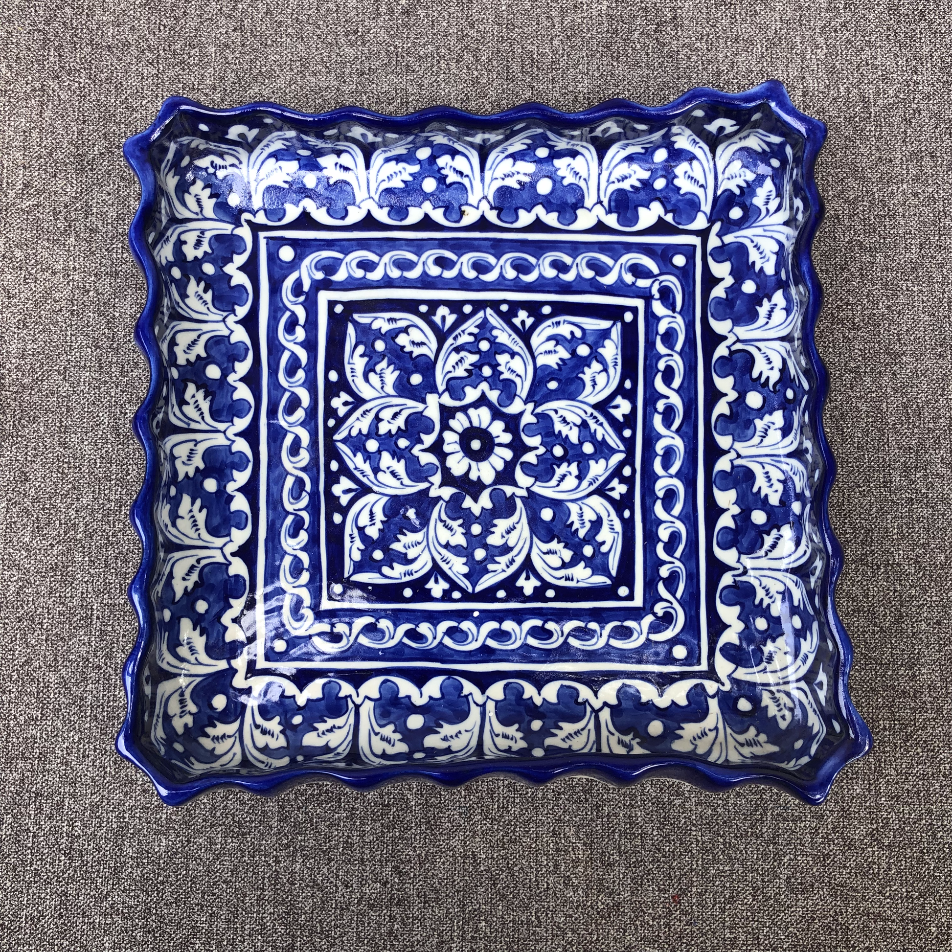 This is a medium sized dish made of ceramic by hands. It features an intricate pattern in deep blue and brown undertones. Hand crafted and hand painted by the artisans of Multan. This dish can be used for serving food such as salads, rice, pasta, desserts and many more dishes to enhance hospitality.