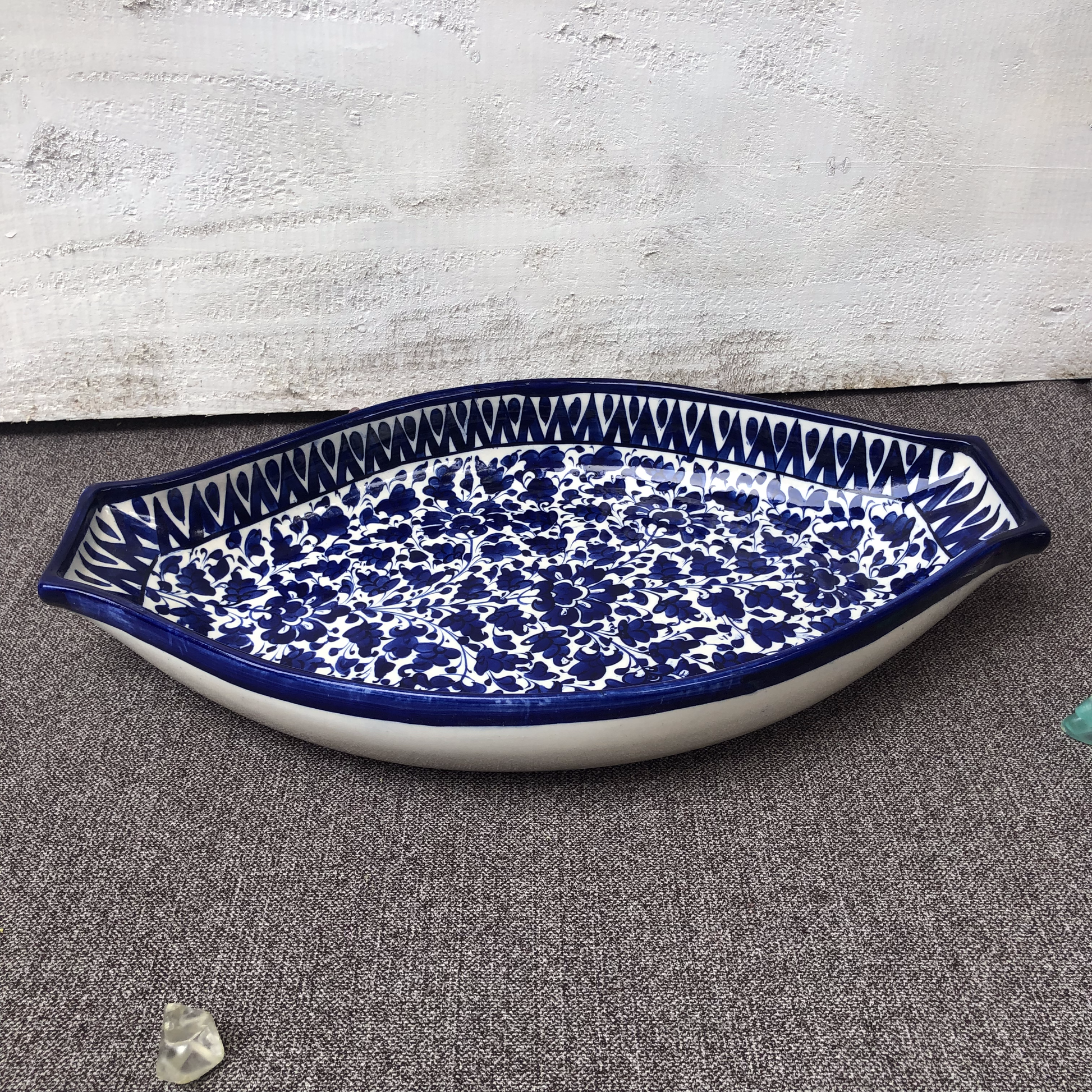 This piece of ceramic dish is large in size and has an oval shape. Designed for bigger servings. It features an intricate pattern mixed with an abstract in an ocean-blue undertone. Handcrafted by the skilled artisans of Multan. This beautiful dish can be used for presenting Rice, BBQ, and many more.