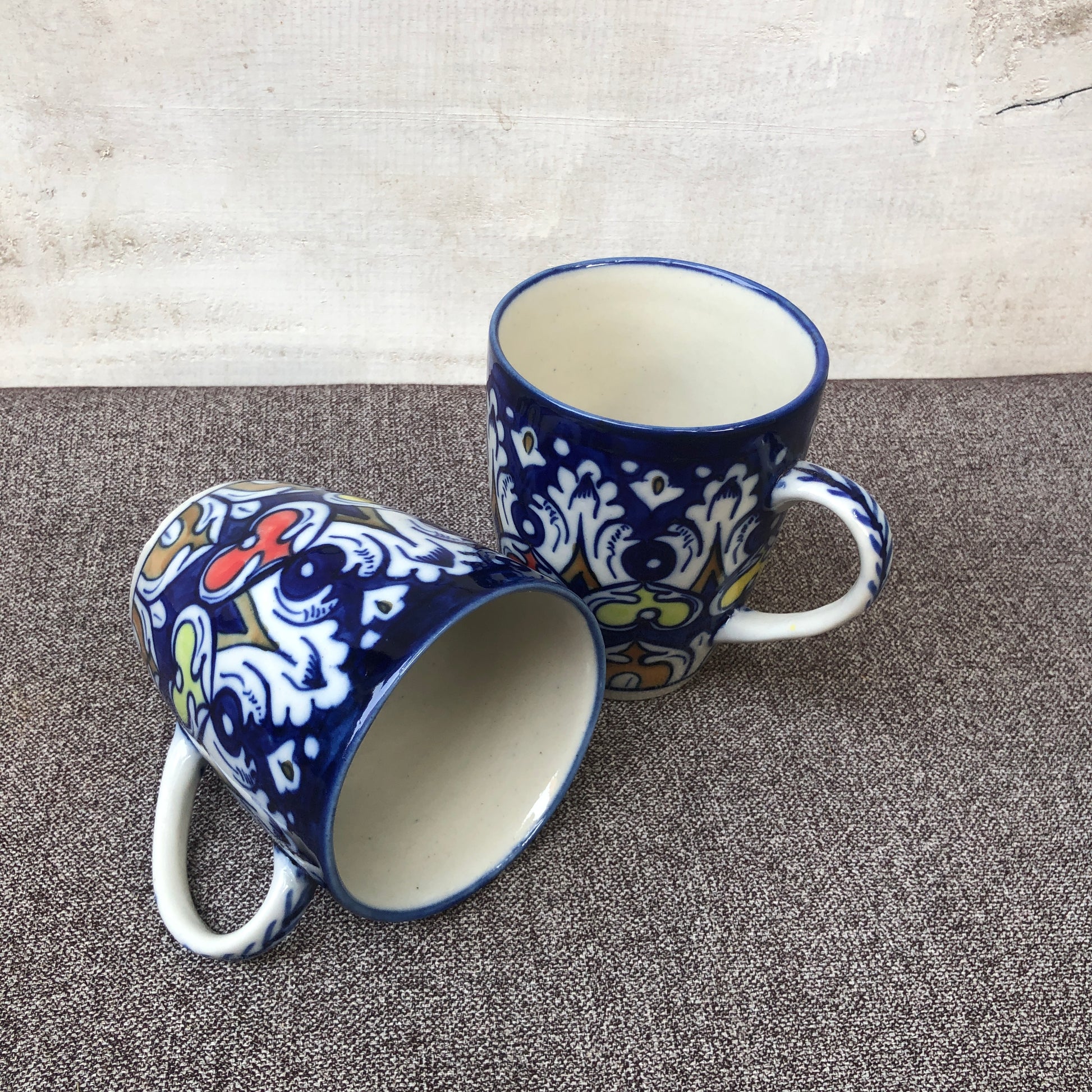 A large mug is a must-have in your crockery. This large mug has a distinctive colored pattern along with a blue undertone. Hand-painted by the artisans of Multan and is hand-glazed for an artisan-made look.