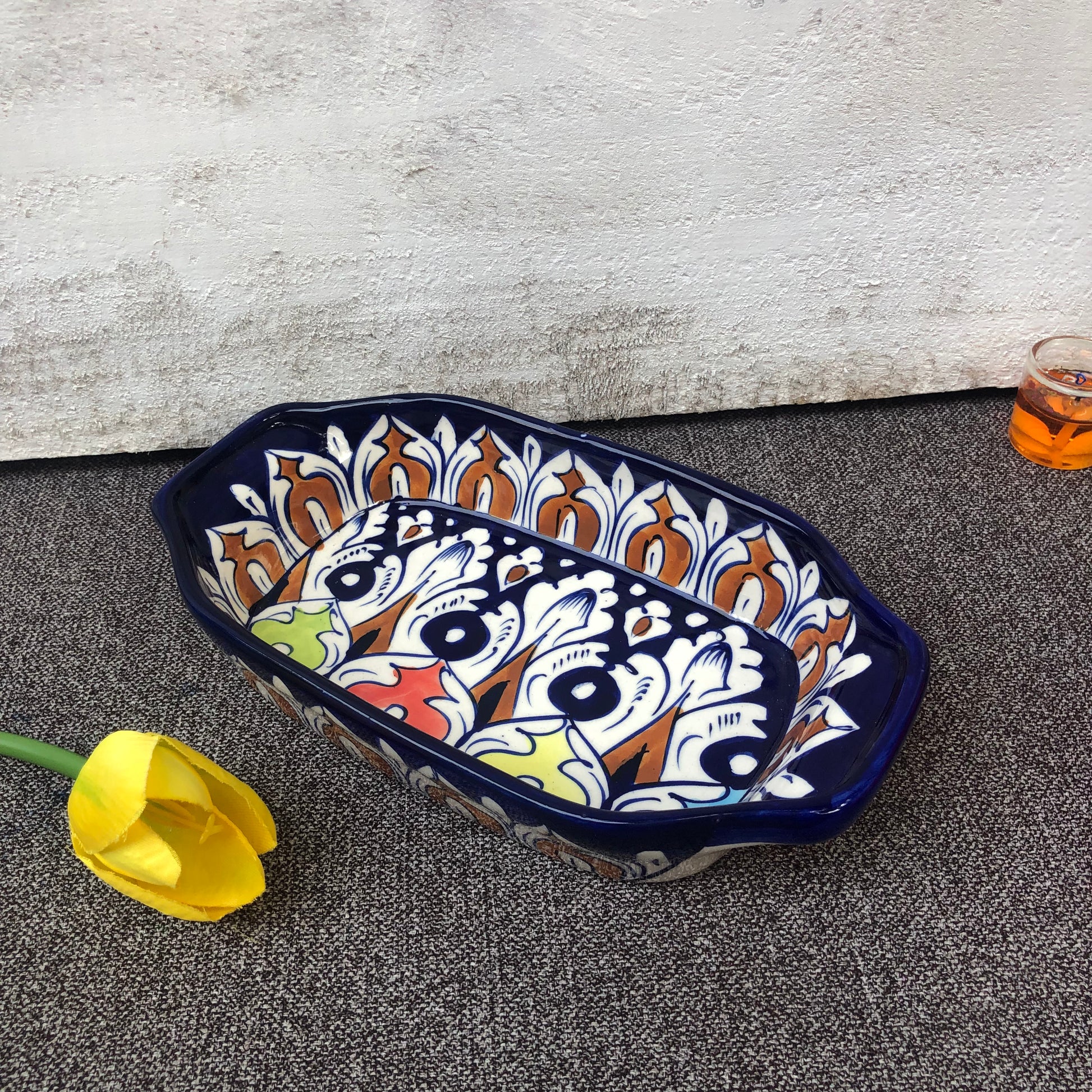 This unique ceramic piece is designed to serve parties. It features an intricate pattern mixed with an abstract ocean-blue undertone. Handcrafted by the skilled artisans of Multan This beautiful dish can be used for presenting BBQ and many more.
