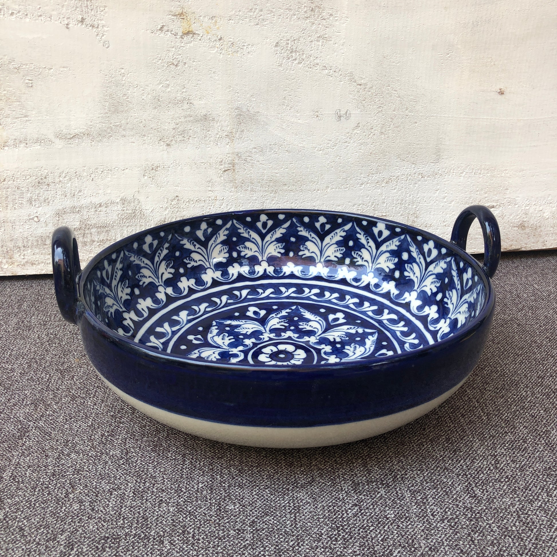 This ceramic karahi gives a fresh appearance. It features an ocean blue intricate pattern. Hand-painted and handcrafted by skilled artisans. The glaze is put by hands for the artisan-made look. Produced in Multan. This karahi can be used to serve any food like chicken karahi, curry, and qormas. Cooking in this karahi is not recommended.